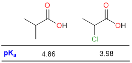 The effect of substituent on acidic strength can be seen in the two examples above. Due to the electron-withdrawing effect of the chloro group, the pKa of 3-chloropropanoic acid is much lower than the pKa of 3-methylpropanoic acid.