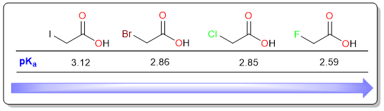 In general, the acidity of carboxylic acid increases with the electronegativity of the substituent attached to the carboxylic acid. For example, in the four haloacetic acids below, the most acidic is fluoroacetic acid because fluorine is the most electronegative among all halogens while the weakest acid is the iodoacetic acid because iodine is the least electronegative.