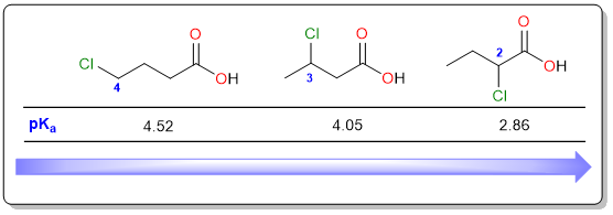 In the diagram above, the most acidic compound is 2-chlorobutanoic acid which is as acidic as chloroacetic acid. This is understandable because the distance between the chloro substituent and the carboxylic acid group is the same in both compounds. As the distance increases, the pKa value increases. 3-chlorobutanoic acid is less acidic than 2-chlorobutanoic acid. The least acidic is 4-chlorobutanoic acid which has a pKa value of 4.52 (very close to acetic acid, pKa 4.75). In general, the effect of a chloro substituent is almost nullified when it is more than three atoms away from the carboxylic acid.
