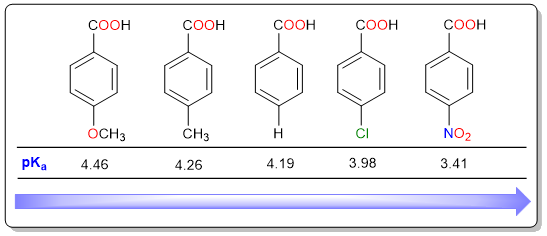 Just like aliphatic acid, benzoic acids are also prone to substituent effects. Electron donating substituents decrease the acidic strength while electron-withdrawing substituents increase the acidic strength. It can be seen that 4-chlorobenzoic acid and 4-nitrobenzoic acid are both stronger than benzoic acid. On the other hand, methyl and methoxy substituents decrease the acidic strength of benzoic acid.
