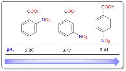 Nitrobenzoic acids are a special case because their acidities cannot be explained solely based on the distance of the nitro group from the carboxylic acid group. It can be seen that there is only a very slight difference in the acidic strengths of m-nitrobenzoic acid (3-nitrobenzoic acid) and p-nitrobenzoic acid (4-nitrobenzoic acid). On the other hand, o-nitrobenzoic acid (2-nitrobenzoic acid is a much stronger acid.