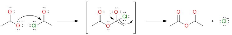 The reaction mechanism is quite simple. It starts with the nucleophilic attack of acetate ion on the acetyl halide molecule to form a tetrahedral intermediate which collapses to yield acetic anhydride.