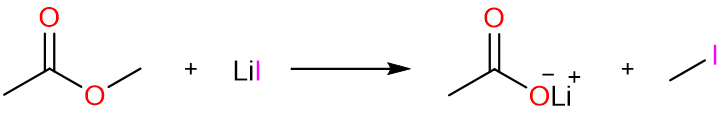 The reaction starts with the reaction of methyl acetate with lithium iodide to give methyl iodide and lithium acetate.