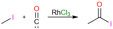 The carbonylation of methyl iodide with carbon monoxide yields acetyl iodide.