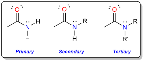 Amides are derivatives of carboxylic acids where the hydroxy group of a carboxylic acid has been replaced by a primary or secondary amine. Based on how many carbon atoms are directly attached to the nitrogen atom, amides can either be primary (1°) or secondary (2°), or tertiary (3°).