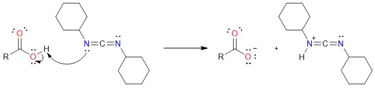 The reaction starts with the deprotonation of the carboxylic acid by one of the nitrogen atoms of the DCC molecule.