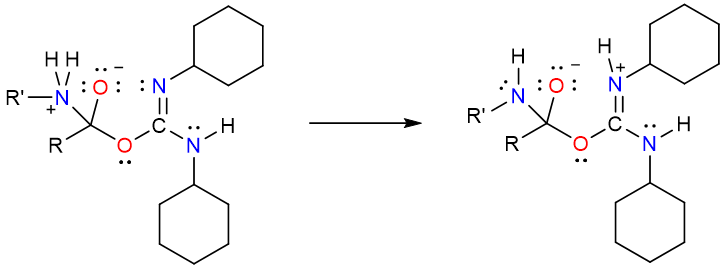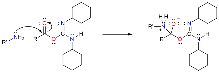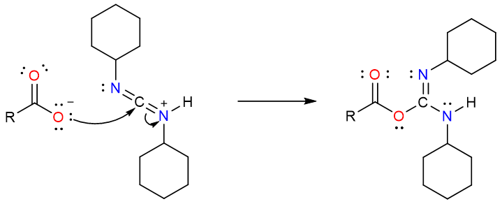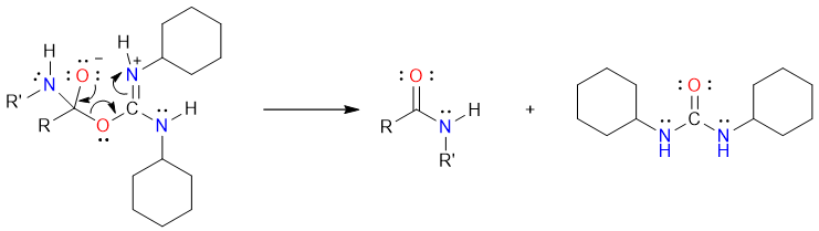 Finally, the electron push from the negatively charged oxygen atom results in the formation of an amide and a substituted urea byproduct (N,N’-dicyclohexylurea).