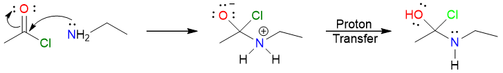 Acyl halides and acid anhydrides are very unstable and even react with very weak nucleophiles. The reaction starts with the nucleophilic attack of the amine on the carbonyl carbon forming a tetrahedral intermediate that undergoes a proton transfer to yield its neutral counterpart.