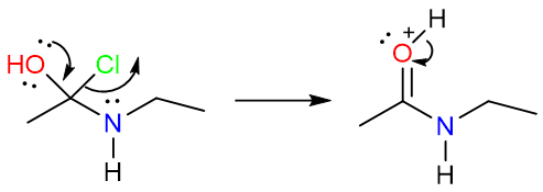The electron push from the hydroxy group moves resulting in the chlorine atom leaving with a pair of electrons. A protonated amide is formed as a result.