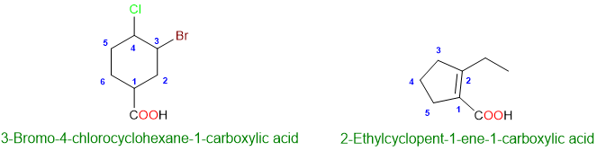 When the carboxylic acid functional group is directly attached to a cycloalkane ring, the suffix used for nomenclature is “carboxylic acid” instead of “oic acid”. The numbering starts from the carbon that has the -COOH group attached and goes on to cover the ring in the direction which covers the nearest substituent first.