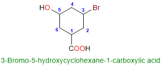 In the compound above, the distance from the carboxylic acid to either the bromo group or the hydroxy group is the same. However, we numbered the ring in the anticlockwise direction because that covers the bromo group first. This is because the bromo group takes preference over the hydroxy group. After all, its name starts with “B” while the hydroxy starts with “H”.