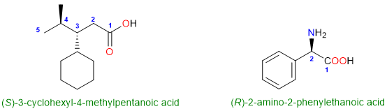Finally, let’s discuss some nomenclature with ring substituents. When the chain contains the carboxylic acid group, the ring attached to the chain becomes the substituent. There is nothing too difficult to remember about the names of these compounds except that the benzene ring is written as the phenyl group. The names of cycloalkane substituents appear as “cycloalkyl”.