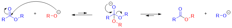 In transesterification reactions of esters, one alkoxy group (RO-) is substituted by another different alkoxy group. These reactions are either acid catalyzed or base catalyzed.