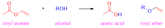 Transesterification reaction is also employed to synthesize derivatives of vinyl ethers. Vinyl ethers are difficult to synthesize by other methods. Vinyl acetate which is cheaply available is reacted with different alcohols to produce derivatives of vinyl ethers.