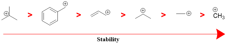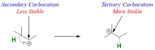 Hydride shift is a type of rearrangement reaction in which a hydrogen atom in a carbocation rearranges (shifts) its position to change that carbocation to more stable carbocation. The shifting of hydrogen from one carbon to another carbon results in a structural isomerism. As shown below, the C-H bond adjacent to carbocation interacts with the empty p orbital of carbocation and the bonding electron pair moves to form a stable tertiary carbocation.