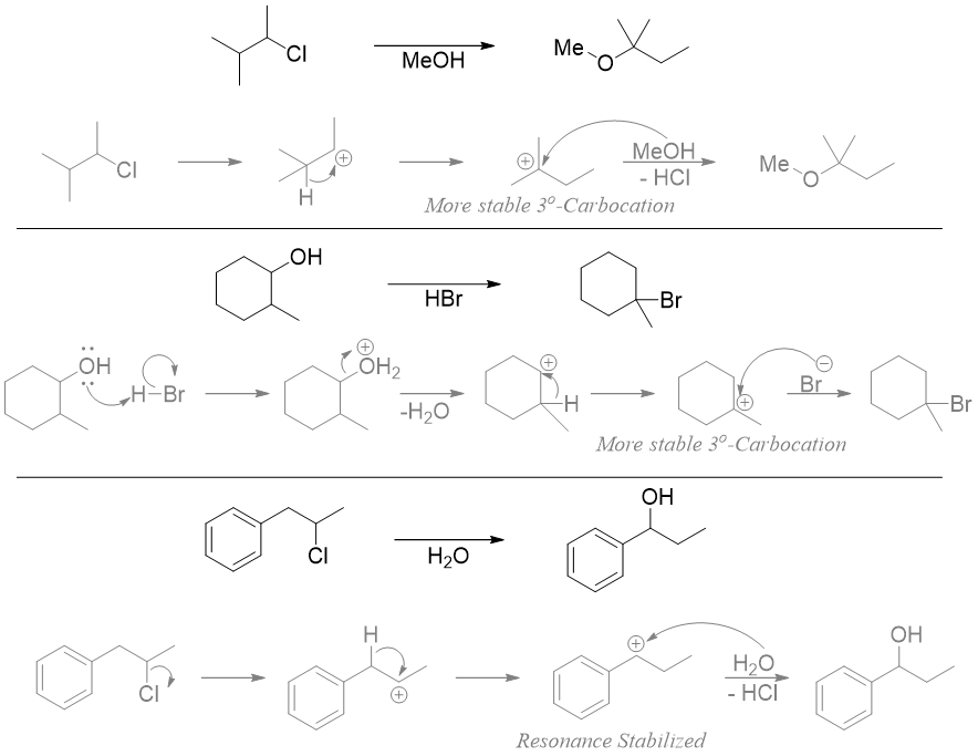 The hydride shift rearrangement mainly occurs in SN1 reactions. The carbocations formed in first step of SN1 reactions rearranges to form mores stable cation. After rearrangement the nucleophile adds to the carbocation. Following are some examples of SN1 reaction undergoing hydride shift rearrangement reactions.