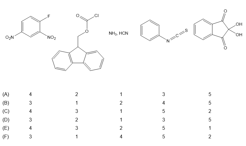 Each of the following reagents is used for the study of amino acids and/or peptides. Assign the role of each from the following choices by choosing the answer that has the appropriate number listed under each reagent structure.