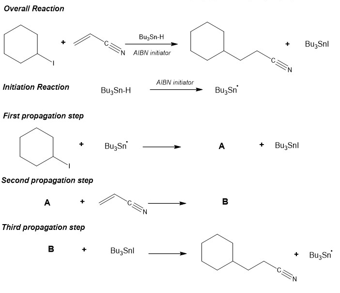 The following reaction goes by a free radical chain reaction. The overall reaction and the initiation reaction are shown. Continue the reaction scheme by providing the structures of the two intermediates A and B in the propagation steps.